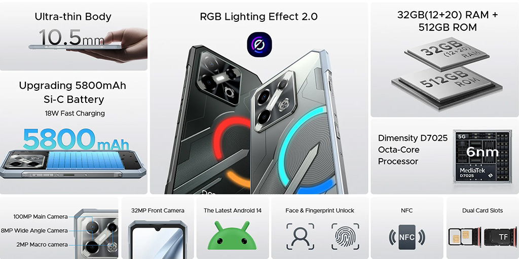 - Cấu hình: 6.79" FHD Plus 1080x2460 120Hz, Ram 16Gb, Rom 512Gb, Chipset MTK Dimensity 8200 5G 8 nhân, GPU Mali-G610, Camera 50MP - 50/200MP, Máy chiếu DLP 100 Lumens, Cảm biến vân tay, Pin 23800mAh, Sạc nhanh 120W, Đèn Pin Cắm trại 280 Lumens