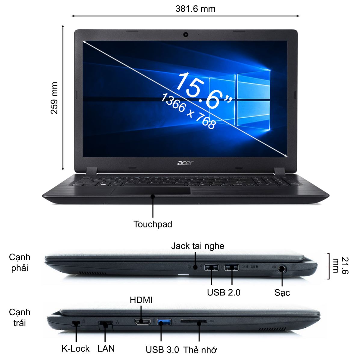 - Hỗ trợ: 2xUSB-A 2.0, USB 3.0, HDMI, 3.5mm Audio